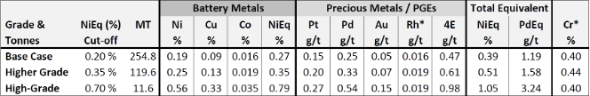 2) Inferred Mineral Resources are reported at a base case cut-off grade of 0.20% NiEq. Values in this table reported above the cut-off grades are only presented to show the sensitivity of the block model estimates to the selection of cut-off grade. Equivalent grade and contained metal calculations do not include Rhodium and Chromium values as denoted by *.