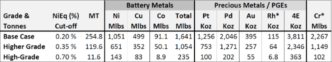 4) Mineral Resources are reported at a base case cut-off grade of 0.20% NiEq using metal prices of $9.00/lb Ni, $3.75/lb Cu, $24.00/lb Co, $1,000/oz Pt, $2,000/oz Pd and $1,800/oz Au, assumed metal recoveries of 80% for Ni, 85% for copper, 80% for Co, Pt, Pd and Au, a mining cost of US$2.50/t rock and processing and G&A cost of US$18.00/t mineralized material.