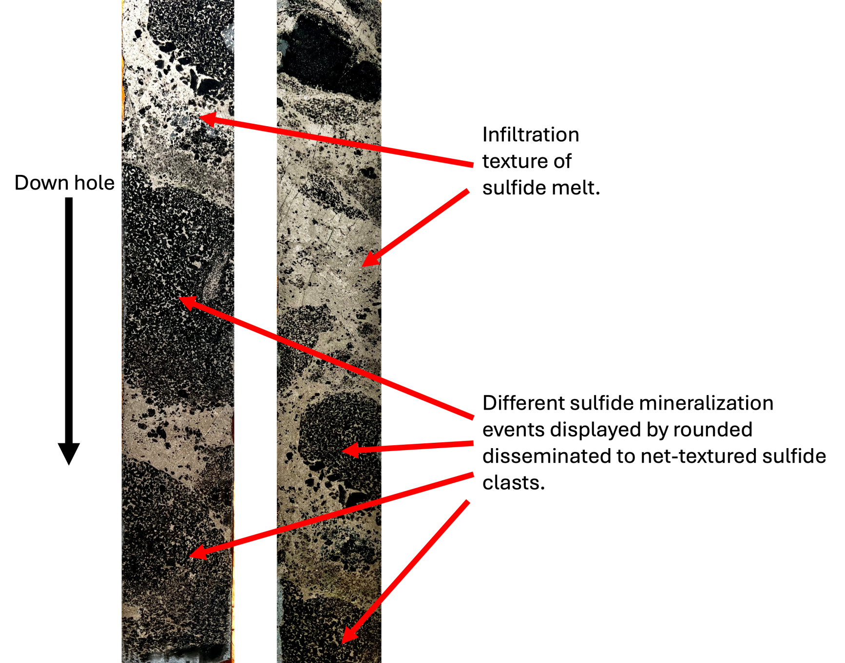 Figure 4: Core from drill hole IM2025-01 at the HGR deposit area at Iron Mountain – Net-textured to semi-massive mineralization displaying sulfide liquid percolation textures is shown from around 417m depth.