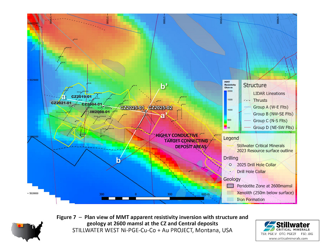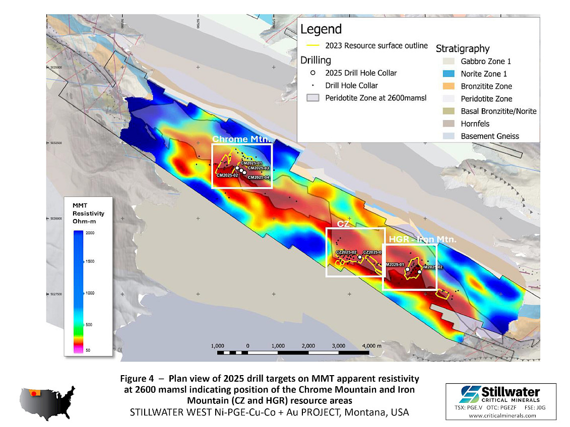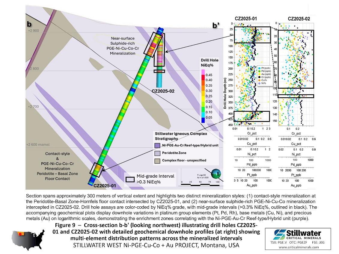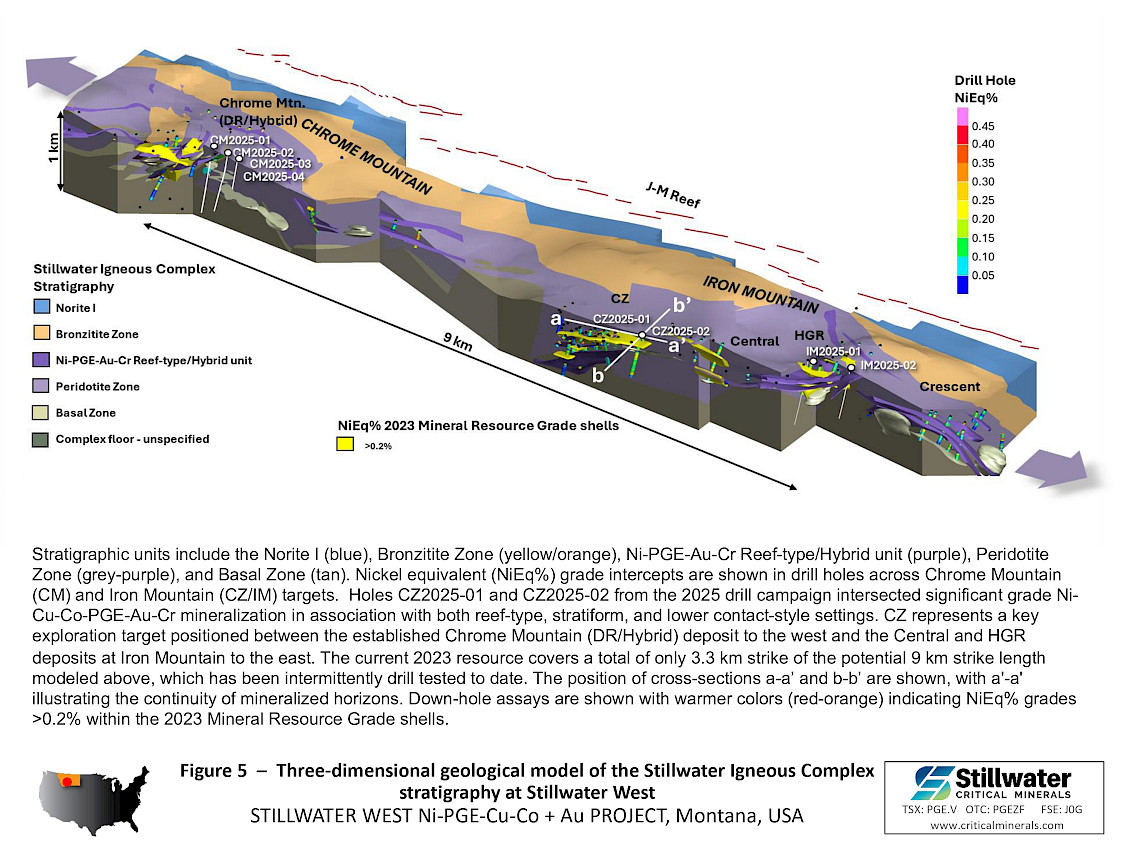 February 26, 2026 – Vancouver, BC – Stillwater Critical Minerals Corp. (TSX.V: PGE; OTCQB: PGEZF; FSE: J0G) (the “Company”, or “Stillwater”) reports the first results from its 2025 resource expansion drill campaign at the Company’s 100%-owned Stillwater West project in Montana, USA. Stillwater West is one of the few U.S. critical minerals projects with a significant nickel and platinum group element (“PGE”) resource and is located immediately adjacent to Sibanye-Stillwater’s Stillwater mines, the only primary PGE producer in the United States. This release is focused on the CZ deposit area at Iron Mountain where drilling intersected shallow, near-surface sulphide-rich polymetallic nickel-copper-cobalt-platinum-palladium-gold (“Ni-Cu-Co-PGE-Au”) mineralization that extends beyond the limits of the January 2023 Mineral Resource Estimate (“MRE”).