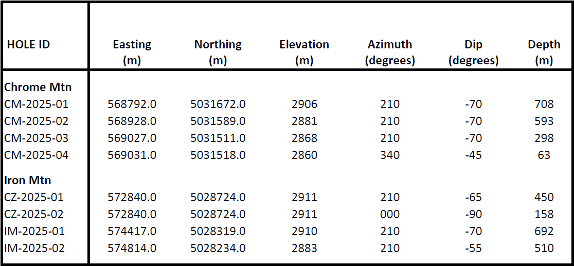 - Chrome Mountain – four holes in the DR/Hybrid deposit area to test the eastern extension of the resource area; and