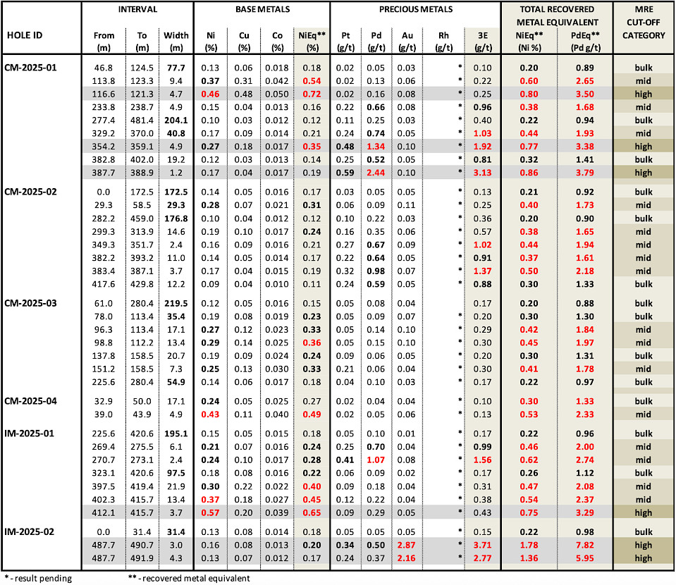 - Assays for rhodium and other co-products are pending from all eight holes from the 2025 program.